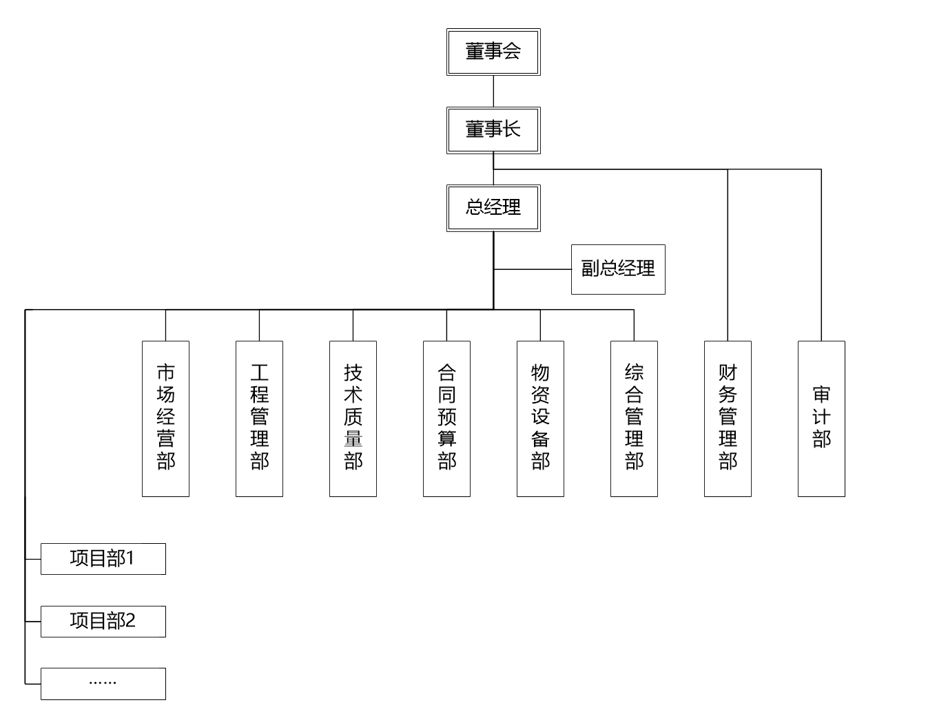 公司建立了现代企业组织结构,设有市场经营部、工程管理部、技术质量部、合同预算部、物资设备部、综合管理部等8个职能管理部门,下设一个建筑设备租赁公司及一个建筑劳务公司。